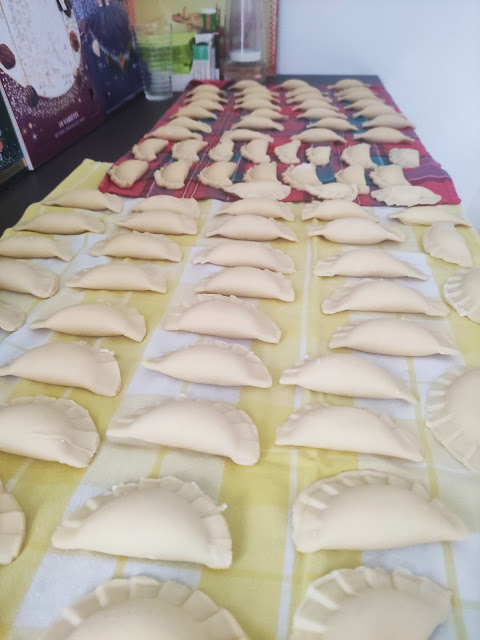 Po tym czasie odcedzam i wykładam na tace, tacki, deski wysmarowane oliwa. Odczekuje aż ostygną. Następnie na mniejsze tacki - u mnie pokrywki od pudelek do przechowywania żywności - wykładam je już zimne. I wkładam na 45 minut do zamrażalnika. Na płasko, każdy pierog odseparowany od swojego kolegi.